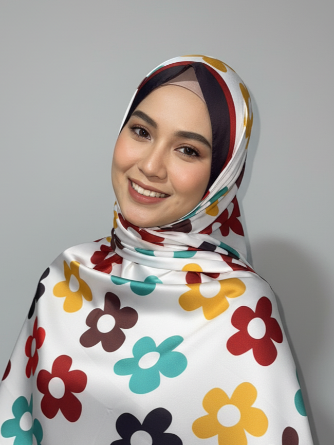 Satin finish with a smooth glossy surface. Its flowy drape offers a luxurious look and feel, adding elegance to any outfit. The shawl’s lightweight nature ensures comfort with versatile dimensions that allow multiple styling options. Perfect for enhancing your wardrobe with a touch of sophistication.